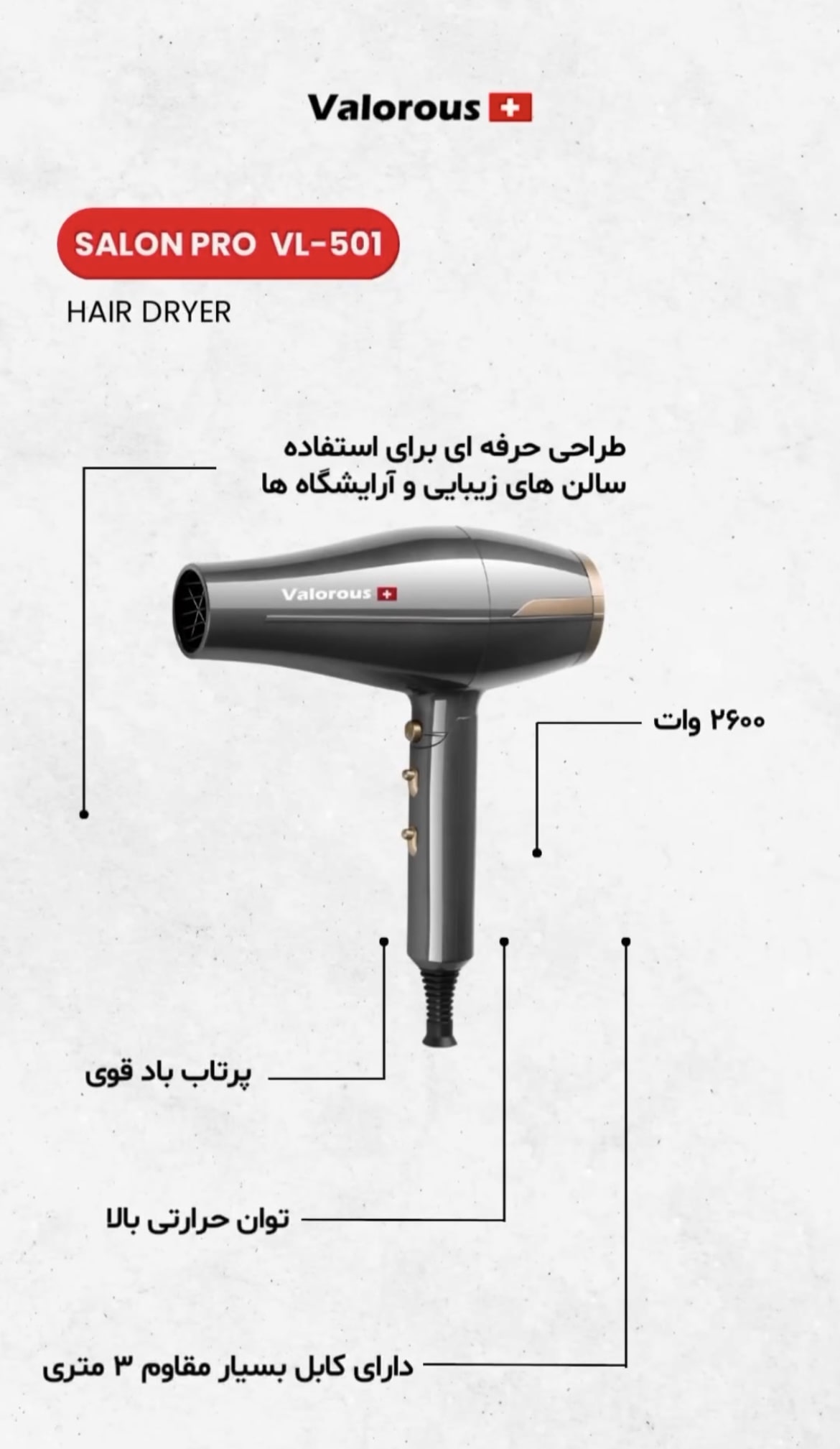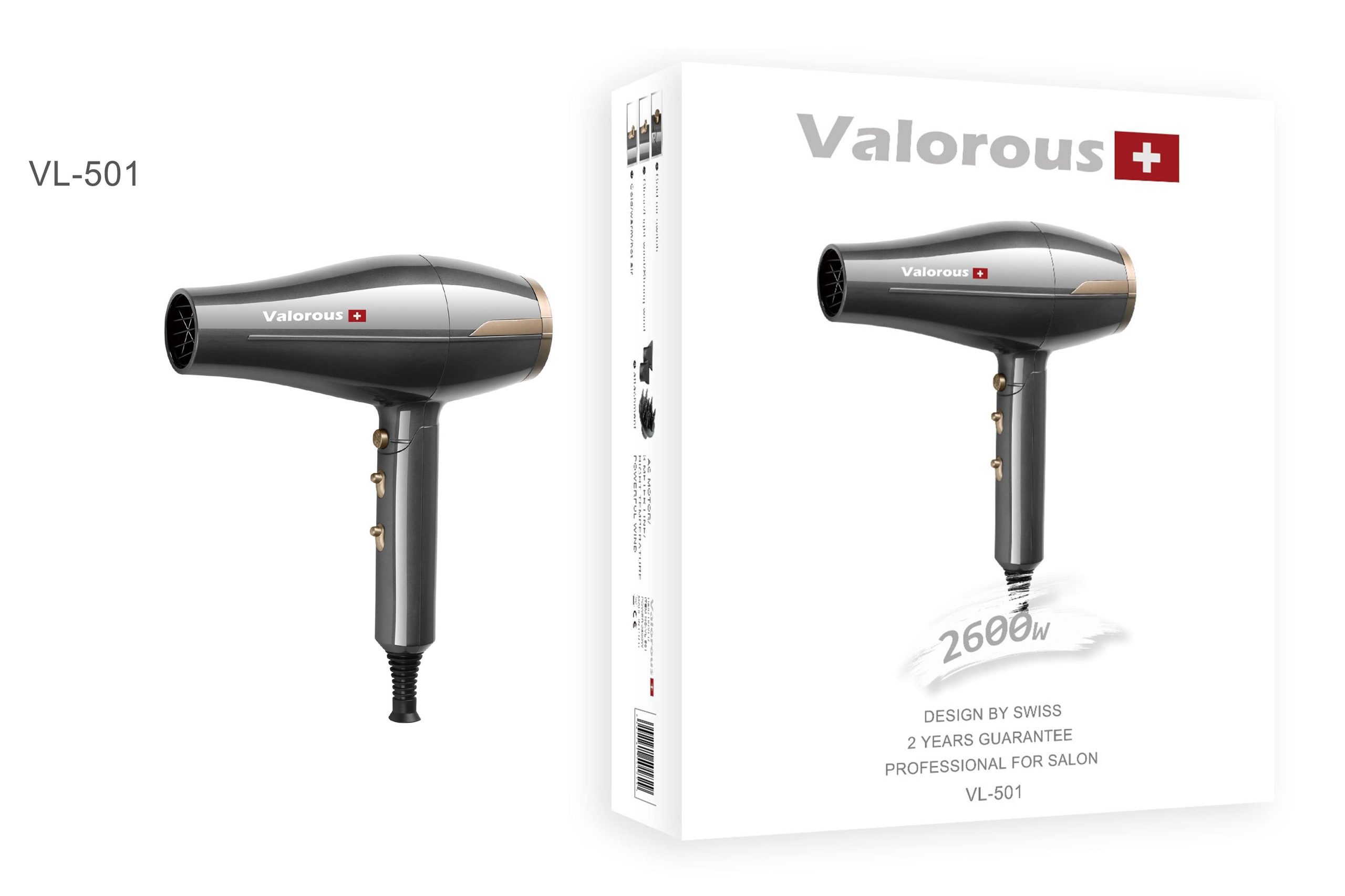 سشوار حرفه‌ای ولروس مدل Valorous VL-501 با توان 2600 وات و باد بسیار قوی